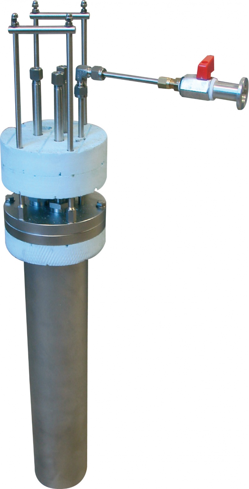 Kriostat składa się z izolowanego maszynowo miedzianego bloku wyrównawczego z średnicą wewnętrzną rury 80mm o długości 480mm, przymocowaną za pomocą kołnierza z wieczkiem na 3 termometry, portu próżniowego i wtyku Lemo do czujników temperatury oraz z grzałki.
